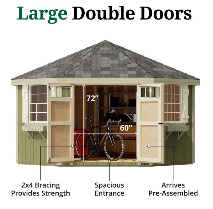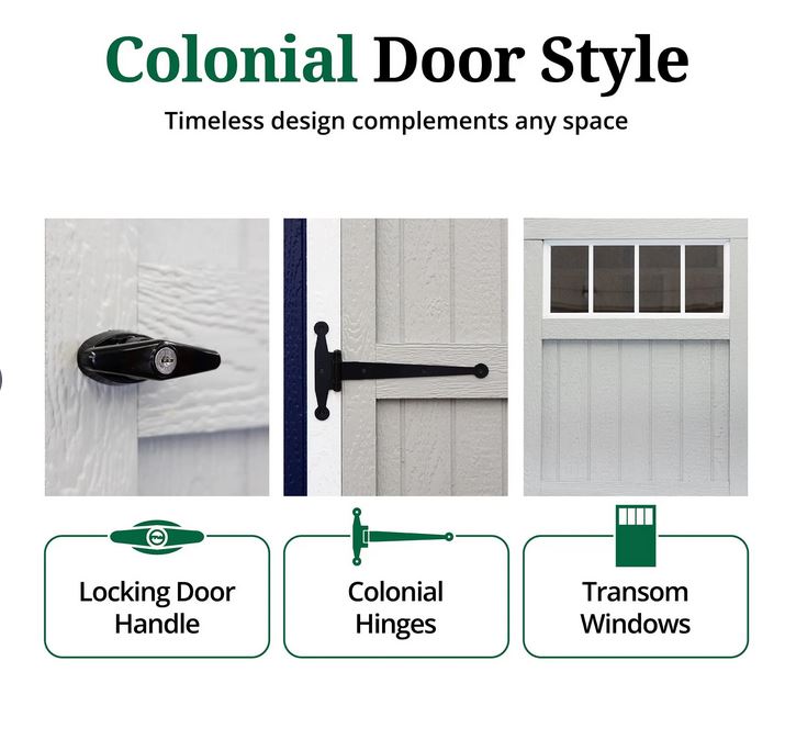 - Pre-assembled double doors with locking door handle, large colonial hinges, and transom windows