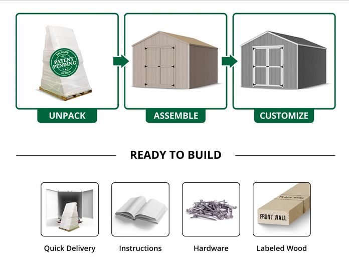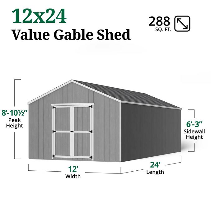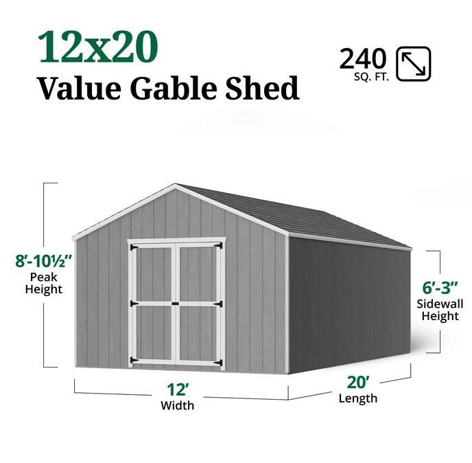 Value Gable Shed with 72" Sidewalls. Made in the USA! The shed comes pre-cut and ready to be constructed. Multiple sizes available, ranging from 8' x 8' all the way up to 12' x 24'. Please browse all of our images to see the exact dimensions of each shed. Our Pre-cut Kits come with everything pre-cut, labeled, primed and ready to assemble. NO EXTRA CUTTING REQUIRED.