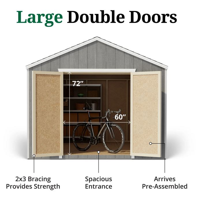 - -Pre-assembled double doors (72" height) with metal door latch and 2x3 bracing to prevent sagging