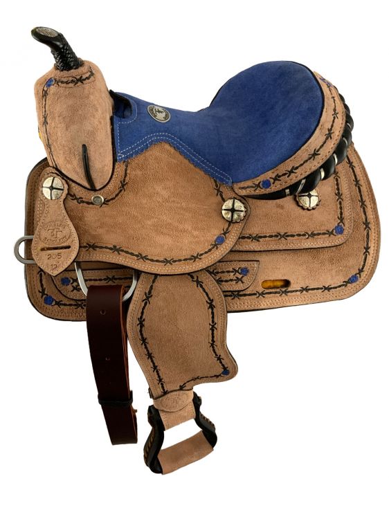 12" Double T Youth Pleasure style saddle set comes with blue suede seat and a barbwire branding. This saddle is rough out in color and is accented with a blue stitched flower motif and black leather stirrups. Cantle features black leather with silver lacing. Saddle comes equipped with front D rings, leather latigo tie strap, off billets. Comes complete with a matching headstall with reins and a breast collar